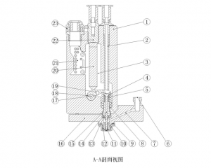动作说明:外部液体由此流入喷嘴中。顶杆(2)上设有进气孔(24),调节杆(22)上设有出气孔(25),外部压缩气体由进气孔(24)进入阀体,经过阀体内部型腔后,再由出气孔(25)排出,由此组成压电点胶阀的冷却系统,以给长时间工作的压电叠堆进行冷却。