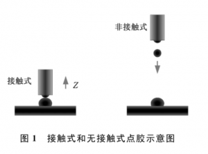 接触式点胶是依靠点胶针头引导胶液与基板接触,延时一段时间后使胶液能浸润基板,然后让点胶针头向上运动,胶液借助和基板之间的黏性力与点胶针头分离,从而在基板上形成胶点。其技术特点是需要配置高精度的高度传感器,以此准确控制针头下降和抬起的高度。